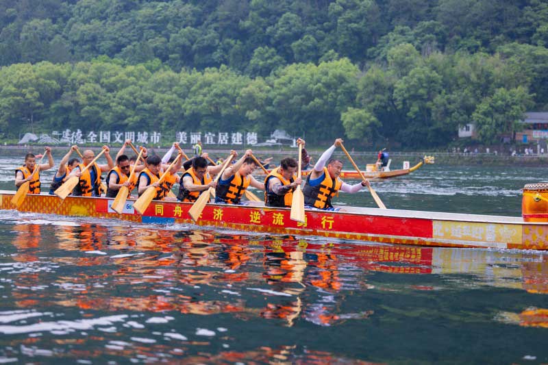 9支參賽隊伍分別登場亮相,龍舟健兒高喊著振奮人心的口號,吶喊聲響徹新安江畔。
